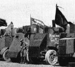 On the armored car reduction is written: Isp. Kom. S.R.S. i Kr. Dep. I do not know precisely, but I think that it: Executive Committee of the Union of Russian Socialists and Red Deputies. It is a photo of 1917. Petrograd, bolshevik revolution.