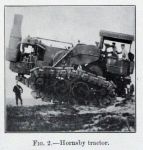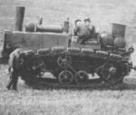 "The 1896 machine from Hornsby was redesigned in 1905 and equipped with full tracks. The engine was the same single cylinder used in the wheeled unit."