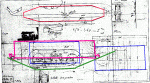 It was a plan view of the Ford 2-Man that was a clue. It struck me that it looks very similar to the plan view at bottom right in M Thibier's drawing. His original idea must have been just a general outline of a box structure sitting between Holt tracks, rather like the Ford. Estienne seems to have added the larger box (in pink) with the added wheels or rollers front and rear to assist in crossing trenches, ditches, etc. I suspect that he also added the green line to illustrate how the attachments would work. The little drawing of a wedge-shape above it must be his first suggestion of shaping the bow like that of a ship.