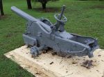 Hi some observations... To me the barrel appears upside down and the elevation gear does'nt appear to fit in the lugs which are spaced too wide, and might indicate this is not the original mounting for the gun.... On the other hand a close inspection would probarbly determine if the two rings on the elevation gear lugs are actually washers, which if moved outwards would enable it to seat... even so it doesnt look a good fit and I suspect the breech is actually sitting on a cross member or some obstruction not visible in the photo.....