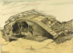 This drawing, by Sir William Orpen, is titled "H.M. Land Ship Shell Out". It was posted recently on the IWM site. I think that it portrays a tank from A Company, since the extended grenade roof and retro-fitted hydraulic cylinder armour seen in photos of A Co. vehicles are present on this wreck. "Shell Out" was a musical revue which debuted in 1915 and ran for 300 performances, so this may be another A Co. tank named after a musical.Â