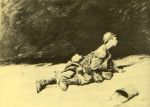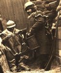 Other interesting items I think are the waders, the jerkins and something that the standing man has on his helmet. Which he has on top of a woollen cap. I don't know if the French army had different containers, as they had the pinard and soupe on the menu, so what these are drinking? Or coffee? Many pictures (and model figures) show 'l'hommes du soupe", unspectacular carrying canteens or containers but these were among the bravest, many records about their daily dangerous runs out of the trenches, getting some feeding for their units. Painting is by Georges Scott, I think one of the most talented war artists.