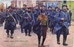 All I can do is add to the above: The Fusiliers Marins, from 1915, wore the standard navy uniform with ratings in the caps shown in James H's photo above, and petty and commissioned officers in peaked caps. Adrian helmets were worn where issued. They apparently wore the jersey over their striped shirt out of the line, and navy trousers tucked into black leather gaiters, later dark blue puttees. The horizon blue great coat was worn after the change over to that colour. Army issue equipment was as standard. I can't tell whether they made the transition to horizon blue entirely or retained dark blue uniform items as per the Chassuers a Pied.