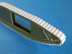 I have never been a big fan of rubber band tracks so I decided to try and make some for my Gaza Mk I Male tank. I first added 2 strips of .030x.040 stripe styrene to the top of the sponson sides. This is just enough to raise the tracks off the sides. Make sure the trough is level because if it is not the tracks will tilt to one side. I then added .010x.040 strip from the first angle in the sponson to around the drive sprocket and sanded it into the .030x.040 strips. Next I cut .010x.250 strip styrene into stripes a little over .093 wide to give it the individual track link look. After I finished applying the track pads I added .020 rod to the link sections and coated them with Mr. Surfacer 500 so the rod would blend into the track pad. I then filed the edges of the rods to an angle as per the real tracks. I am in the process of adding the Archer Fine Transfers Rivets to the tracks. Unfortunately I ran out so I will finish them when I get more. This is a long but easy process and I think they look more realistic then the rubber band tracks.