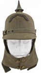This is a first model experimental pickelhaube introduced for Bavarian Alpine Troops in August 1915. Similar to the standard leather pickelhaube, its design is basically a hybrid of the pickelhaube and the alpine cap with neck flap. The helmet originated with the need for Alpine Troops to have a protective helmet for climbing as well as protection from cold weather. The pressed cardboard shell is covered with green-gray sailcloth, a linen material, and features a removable zinc-plated infantry spike. Attached to the front is a simple banner bearing the motto In Treue Fest (In Firm Faith or Steadfast and True). Also, cockades of the national tricolors and Bavarian state colors are attached on either side.