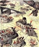 Top stuff. I've seen the one of the war correspondent talking into a microphone. One of his illustrations shows a group of soldiers overlooking what seems to be a tank battle, but I can't get a decent-sized copy of it. He writes of "blockhaus roulants" - moving fortresses - and most seem to be on rails, so presumably he meant armoured trains. The far right pic that Roger has posted seems to show rail or tram tracks. In the pic I've posted at the top, most of the vehicles also appear to be on rails, but the ones bottom left might not be. They certainly bear something of a resemblance to the Saint-Chamond and Renault. One assumes he envisaged them being steam-powered, or maybe he did what you can do if you're a science fiction writer, which is just invent an imaginary means of propulsion.