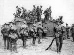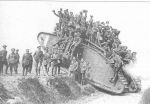 The troops appear to be lining up to climb onto the Tank, and those on top trying to find somewhere to sit.