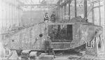 Basically, the final construction was carried out in an erecting shop but large components were constructed elsewhere. These large components included the inner hull with the transverse diaphragms, the outer frame with the angles, and the engine and control levers. Basically the inner hulls were connected by the floor and frontal plates and the rollers put in position supported on temporary axles. Next the outer frames were put in place using rigid axles through the sprocket bearings to line them up (the same technique was used on Churchill tanks in WW2 and visible in the first photo in the last post). The track was drawn into place along the rollers and the tank lowered to the floor. The transmission gearwheels and sprockets were added and the temporary axles for the rollers replaced. The separate engine assembly was added with the rear hull riveted into place and the roof bolted on. Finally the petrol tank, internal and external fittings, sponsons and pipes were added, the tracks connected, the tank painted and driven out of the erecting shop.