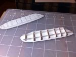Model views with the tanks and one set with the tank supports only. The tanks are segmented into six equal-length segments, presumably water-tight compartments. a single compartment fits nicely at the front. The logical places to support the tanks would be at the bulkheads and end plates, so seven supports per tank. some of these would fall on the doors - not a good place to do this. Other than that they seem pretty well located. The configuration of the supports themselves are not evident from the video or the single still shot. I plan to have a "strap" around the tank at the support, which could be the rib that appears in the photos. Any ideas?