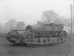 8) Wire rope suspension sometimes failed; as tank was supported by only two wire ropes per side (sprung at the front), this immobilised the vehicle. Tracks could apparently be shed in fast turns, likewise wooden sabots/track shoes. Transmission also suffered as engines were too powerful. Col (Lt Col?) Johnson and others said to have denied problems were as bad as claimed. MM says the project may have suffered a smear campaign. Project cancelled 1922, Tank Design Dept closed 1923, official involvement ended 1924.