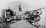 "Prior to the early months of 1918, our own efforts along this line consisted in the building of one caterpillar mount, self-propelled by a gasoline engine and carrying an antiaircraft gun. Around this nucleus an ambitious caterpillar program was built. An 8-inch howitzer was placed on this antiaircraft caterpillar mount and fired at angles of elevation varying up to 45°. Maneuvered over difficult ground, the machine withstood the firing strains and road tests in a highly satisfactory manner. As a result of the success of these tests, orders were placed for three more experimental caterpillars to mount 8-inch howitzers. Tests of two of these completed units were so gratifying that it was felt they warranted quantity production. Accordingly, orders were placed for 50 units of the 8-inch howitzer caterpillars to cost about $30,000 apiece, for 50 caterpillar units mounting 155-millimeter guns, and for 250 units mounting 240-millimeter howitzers.