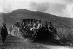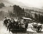 The writer made the first climb on one of the Renaults, in company with eight other passengers, among them being Gen. Swabey, delegated by the British War Office.  We were seated on a couple of seats placed fore and aft immediately above the revolving bands.  The driver was at the rear, and a few local hangers-on clustered around the seat.  Right at the outset we tackled a 30% gradient, which was climbed without any difficulty.  A little later the mule track began to zigzag in order to avoid a particularly steep bit, but the Renault driver preferred to tackle the steeper grassy slope rather than the easier, but rougher surfaced, winding track.