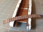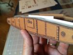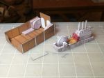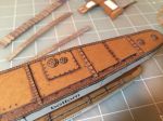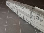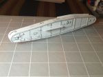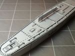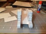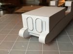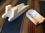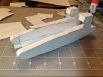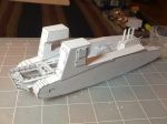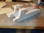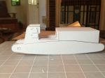 The model is coming along, albeit a tad slowly. The photos show the first build in progress. The pieces on the cutting board are for the rear superstructure. I have two transverse formers at roughly the third points, but nothing longitudinal yet. I hope to finish the superstructure shell tomorrow. So far all seems to be going pretty well. I have applied the hatches to the left cab, but not on the right one, and none of the other details.