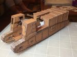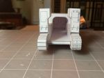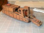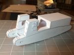More photos. The superstructure fits pretty well. I need to trim at front and back where the box meets the tracks. I have only one internal stiffener at this time. I will add another about half-way to the front face. The cross-girders at the front and rear of the bottom went better than expected; they do help stiffen the hull.