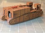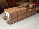 Laying out the interior of the "box" has been an interesting exercise.I modified the engine shown on the Julio Pillet drawing to match the "standard" engine set shown in the MkIV Osprey book and the Great War Tank users manual.This included moving the exhaust off the center line, similarly to the MkIV.The fuel tank is only 4 cu ft, so it would be much smaller than Julio shows it, but the radiator needs to be larger and also needs a blower (fan).I haven't figured out a good bracing scheme yet; that will probably wait till the beta test builds.