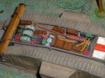 Here it is with crates and canvas rolls added, the crates were dry-brushed with burn umber oil paint over the pale yellow resin. To vary the colour more or less oil paint was left on the brush.