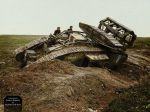Mk.V tank 9038 of C Coy, 8th Battalion, loaded with wooden bridging material and a specially built contrivance for crossing trenches, stranded in a trench near Cologne Farm, in the Bellicourt section of the Hindenburg Defences, Aisne, Picardie on October 4th. 1918. 9038 was later retrieved and in 1919 was sent to Russia as part of the White Russian Army but captured by the Red Russians on January 1st 1921. (Photo source – Australian War Memorial collection E03832) (Colourised by Joshua Barrett from the UK) https://www.facebook.com/pages/Painting-The-Past/891949734182777?fref=ts