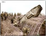 A Mark IV (Male) tank H45 ‘Hyacinth’ of H Battalion ditched in a German trench while supporting the 1st Battalion, Leicestershire Regiment, one mile west of Ribecourt. Some men of the battalion are resting in the trench, 20 November 1917.Commanded by 2nd Lt. Jackson, H Btn, 24 Coy, 10 Sec. During the attack it reached the first objective of the day, The Hindenburg Line, before falling in the ditch. (additional info from John Winner)(Photo source – © IWM Q 6433)Photographer – Lt. John Warwick Brooke(Colourised by Doug)
