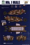 There is no official documentation regarding the colours with which the MkI's were camouflaged, and only a few, rather impressionistic, descriptions. Basil Henriques, a C Coy. officer, described the scheme applied in Britain as reminiscent of a green landscape against a pink sunset. However, he goes on to say that the tanks were repainted shortly after arriving in France using brown with black stripes. A newspaper reporter who saw the tanks on the eve of their first battle describes the colours as reptilian - black, grey, yellow and mottled brown. The scheme shown on the side of the Takom female MkI box "C Company, Somme River, Autumn 1916" may be fairly accurate. It is uncertain how much of the original camo was overpainted in France.