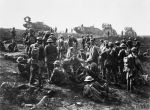 "Battle of the St Quentin Canal (Saint-Quentin). Men of the American 30th Infantry Division at rest with German prisoners following the capture of Bellicourt, 29th September 1918. In the background are British Mark V Tanks with 'cribs' of the 8th Battalion, Tank Corps, which were one of four battalions of the V Tank Brigade allotted to the 5th Australian Division and American Corps for the operation."