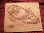 Gwyn Evans has spotted that the picture is probably a tracing of a War Bond Sales poster. This was based on an original tank photograph taken at the 1917 City of London Lord Mayor Show in November.
