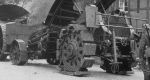 I have attached another picture showing the carriage train in partial disassembly, attaching (or detaching?) the radgürteln (the linked blocks on the wheels). I believe that the brace you enquire about was there to prevent the tarpaulin from getting caught in the radgürteln during transport. It is not visible at any other stage of use of the weapon.