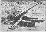 "Late in 1918 an experimental mount for the 155mm GPF gun was developed and one was built, by using a modified 10-ton Renault tractor with gear driven chain treads and a 110 hp airplane motor located in a housing on top of the platform. The mount was arranged to receive the top carriage, chassis, elevating and traversing mechanism of the wheel mount. In order to fire the gun it was shifted from its travelling position in the centre of the platform to the left-hand side of the same and pointed crosswise. Two large outriggers with spades were attached to the platform to stabilise the carriage and jacks were also provided to support the platform. This arrangement gave a field of fire of 60 degrees. The total weight of gun and mount was about 19 tons. The mount was considered as a makeshift and the tests indicated the necessity for many changes in its design, the most important of which were a longitudinal firing position with an opening in the platform for the recoil of the gun, provision for a 10-degree traverse of the gun and the location of the outriggers at the rear of the chassis. It was thought that with the modifications proposed the mount would be fairly satisfactory and the proposed changes were in progress at the end of the war."