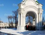 The road to the left is Hrushevsky Street, and to the right, Museum Lane. The building in the background is the National Art Museum of Ukraine.