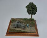 The landscaping is formed from PU insulation foam skimmed with plaster, the small section of wall was cut down from a Preiser set, the lefthand figure is a modified Orion German tank crewman and the righthand one is from Black Army Modells, without a doubt he's one of the best 1/72 sculpts I've seen.